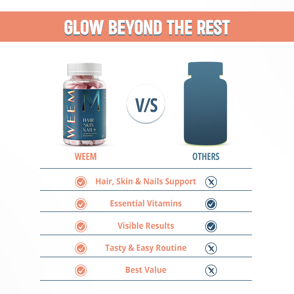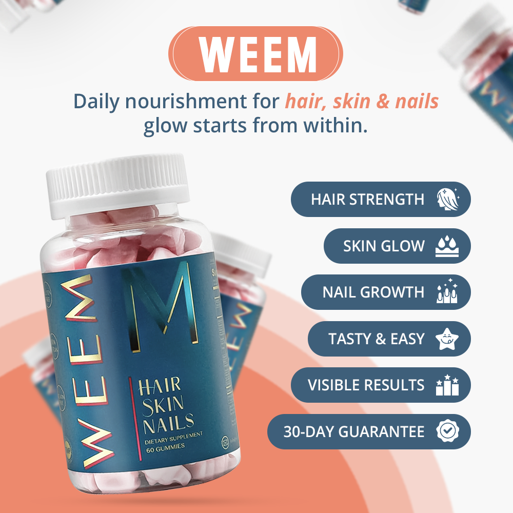 Hair.Skin.Nails promotes your hair, skin and nails overall health, strength and growth. See yourself better in the mirror with Weem.